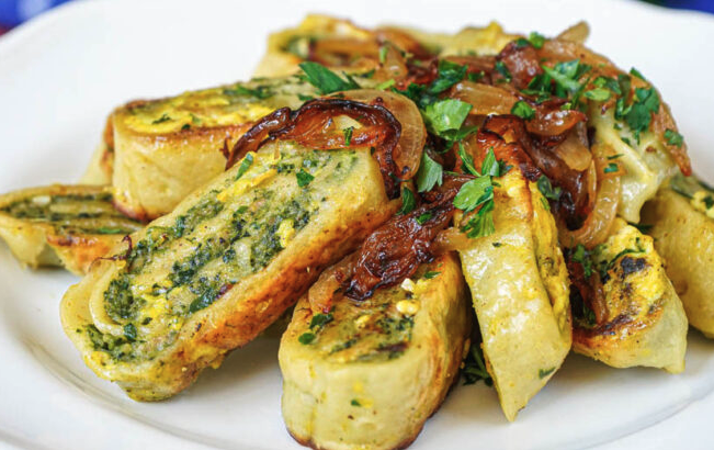 - After rolling dough into a thin sheet, spread filling lengthwise across the sheet, leaving about 1-2 inches (2.5-5 centimeters) free on each side.